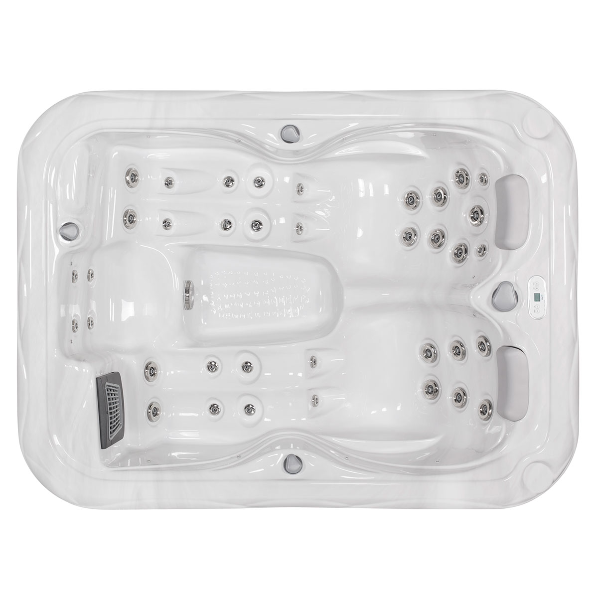 Arrangementet med to tilstøtende hvilestoler og ett sete i Firenze massasjebad er unikt på det europeiske markedet. Ved utformingen av MySeat™-fotsengen har designerne våre eliminert ulempene som skyldes forskjeller i kroppshøyde, slik at både lave og høye kunder kan nyte den samme massasjeopplevelsen. Med en høyde på 76 cm passer denne modellen lett gjennom en vanlig inngangsdør, noe som gjør den svært enkel å installere. Den er romslig nok til å inneholde 37 dyser, og likevel liten nok til å passe inn nesten hvor som helst – enten det er en skyggefull terrasse eller et litt større bad.